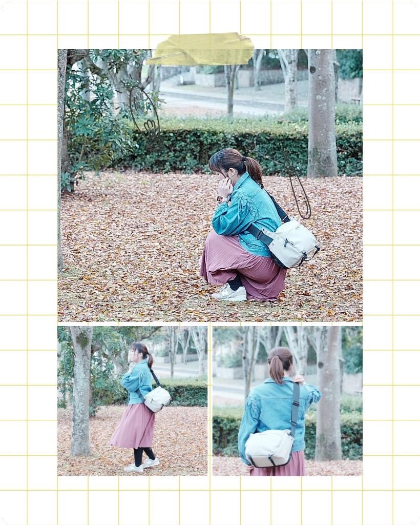 公園で撮影していても軽装でありながら必要な機材はしっかり収納。スタイリッシュで日常使いにも馴染むデザイン 。