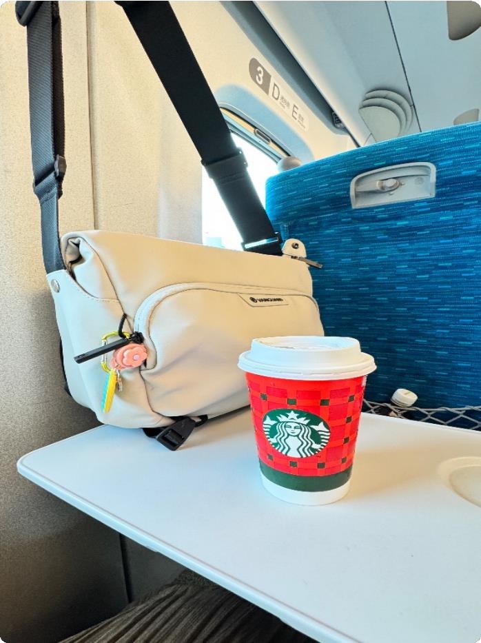 新幹線での移動中も。テーブルに置いてもコンパクトで邪魔にならない。旅のお供に最適なサイズ。