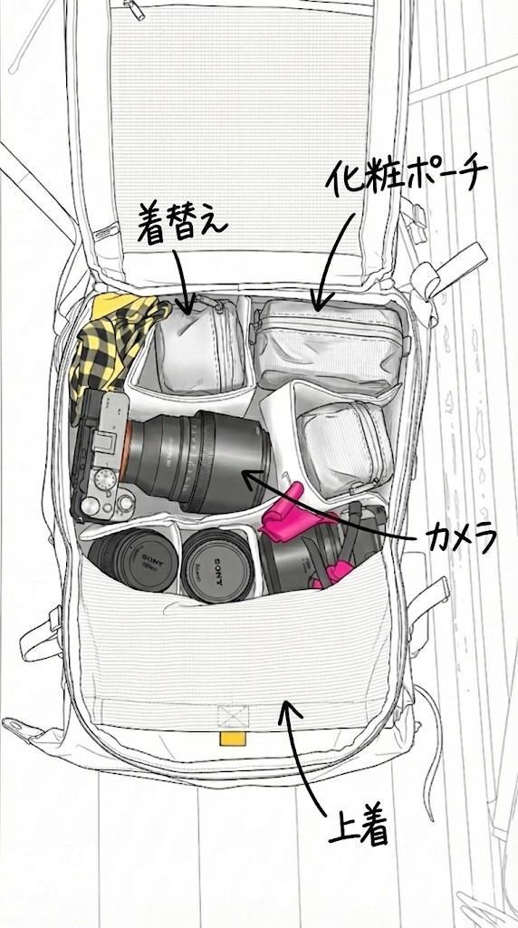 カメラ機材を下層に、丈夫スペースに1泊分の着替えやタオルを収納できる