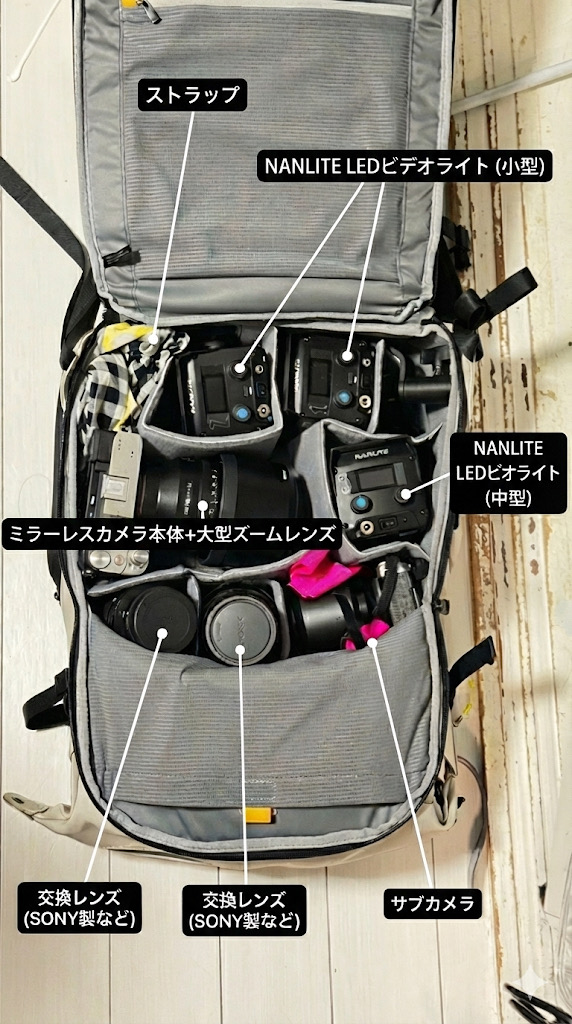 ミラーレスカメラ本体(大型ズームレンズ装着)/交換レンズ(SONY製など)複数本/NANLITE LEDビオライト(小型・中型)/サブカメラ/ストラップ類
