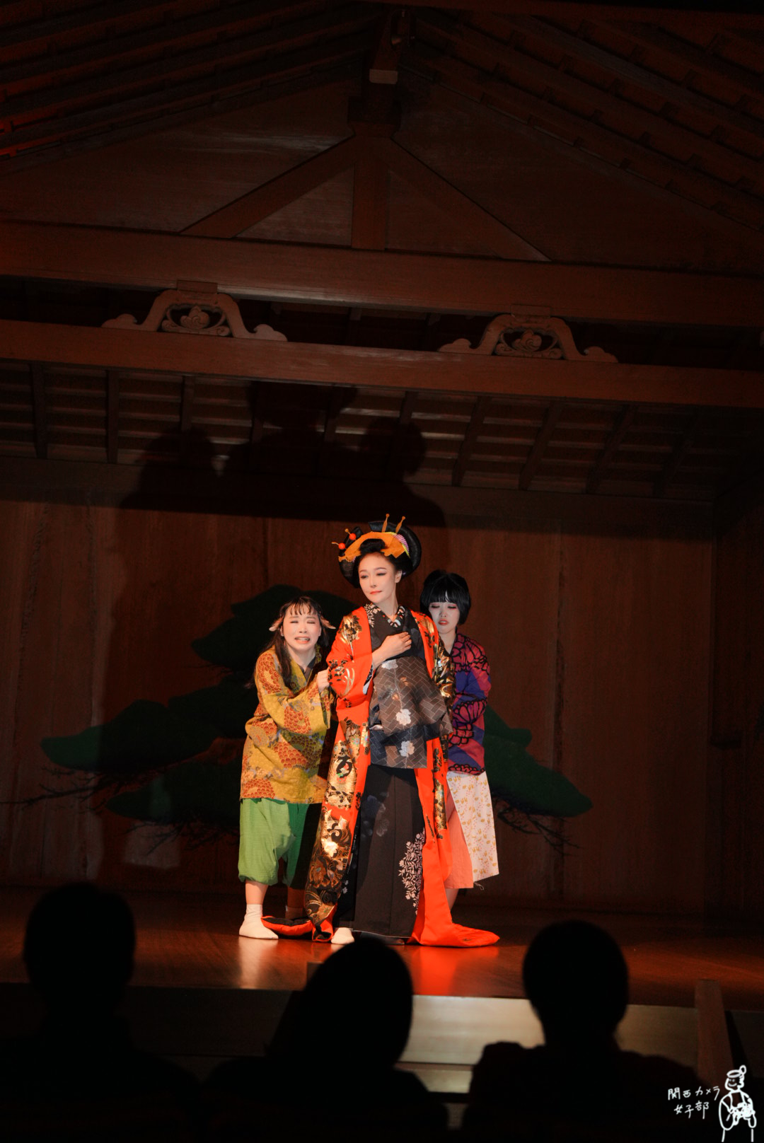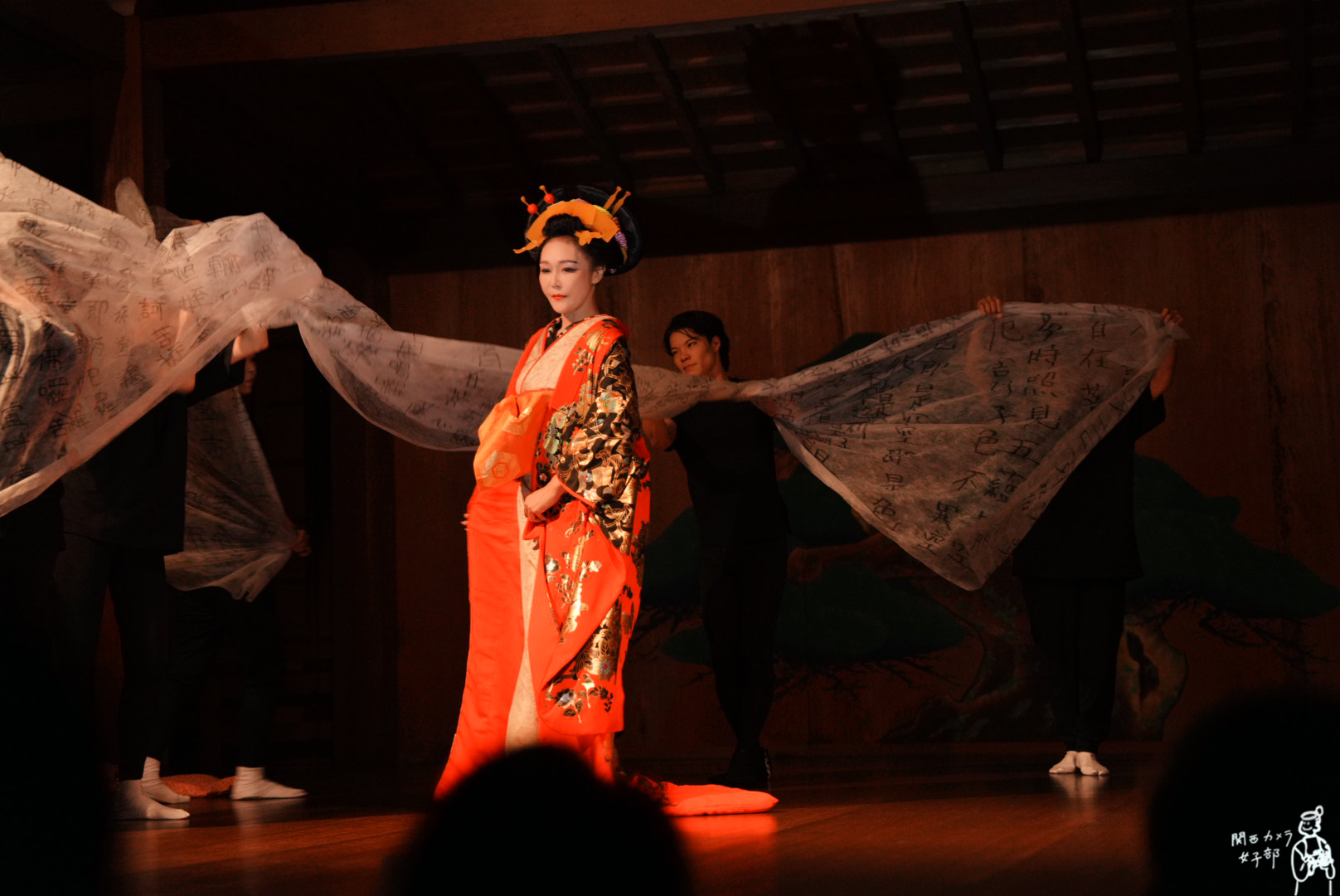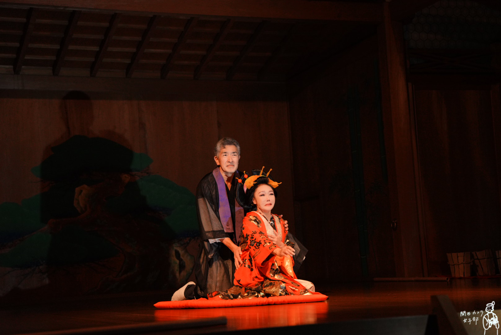 舞台が始まると、その荘厳な能舞台で繰り広げられる二つの時代の物語 ——地獄太夫と一休禅師の伝説、そして堺の町が炎に包まれた大坂夏の陣前夜の物語—— に、私たちは完全に心を奪われました。